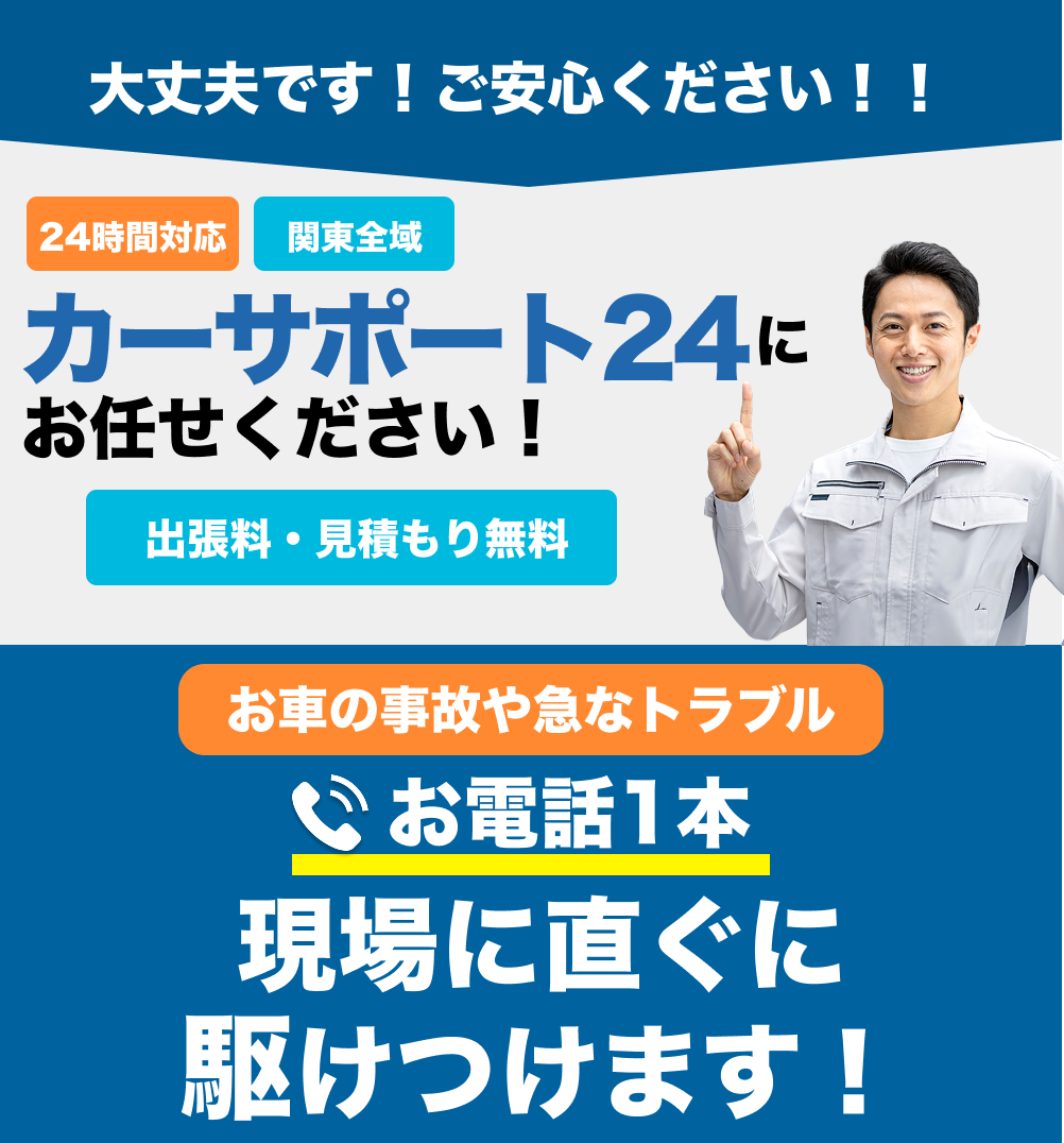 カーサポート24は 関東全域に対応する 24時間ロードサービス です。東京都、神奈川県、千葉県、埼玉県、茨城県、群馬県、栃木県の関東全域で、車のトラブル、パンク、故障などがありましたら、お気軽にお問い合わせください。平日だけでなく、土日や夜間のトラブルにも迅速に駆けつけます。 車の故障や事故など急なトラブル時に、 プロが現場でサポートし、お客様の安心と安全を第一に対応します。 どんな状況でも頼れるサービスを提供していますので、 困ったときはお気軽にご相談ください