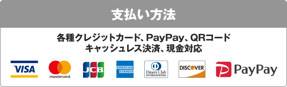 各種クレジットカード、QR決済、電子マネーをご利用いただけます。